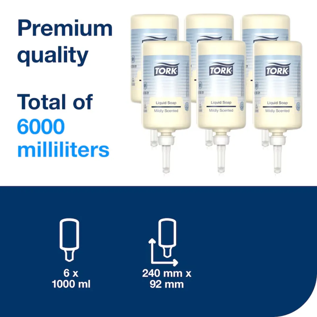 סבון ידיים נוזלי Tork Mildly Scented Liquid Soap דגם 420501 למערכת S1. עדין לעור, בעל ניחוח רענן ורכיבים מלחחים לשטיפת ידיים יומיומית במשרדים ומוסדות.