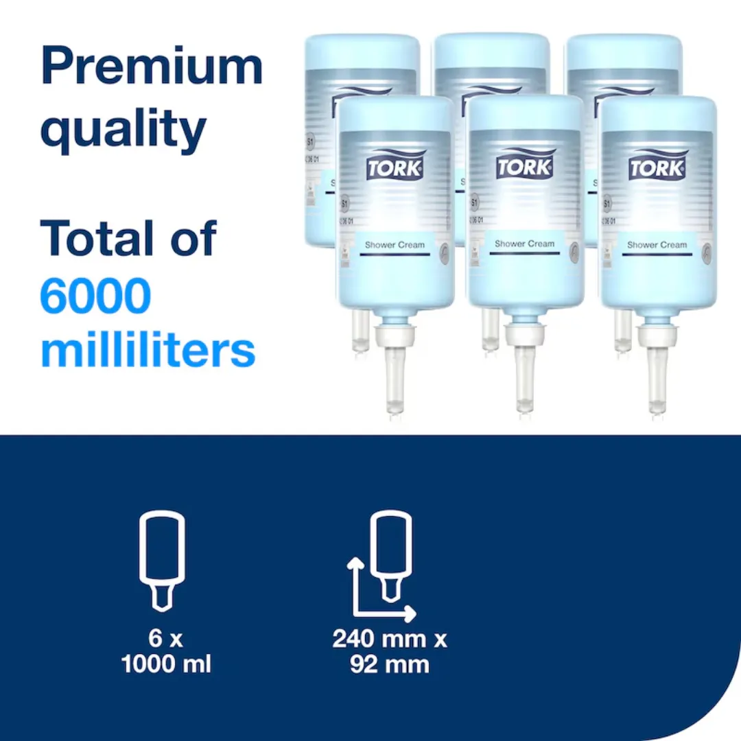 קרם רחצה Tork Shower Cream דגם 420601 למערכת S1. קרם רחצה עדין עם ניחוח רענן, מתאים לגוף ולשיער ומיועד למלונות, חדרי כושר ומתקני ספורט.